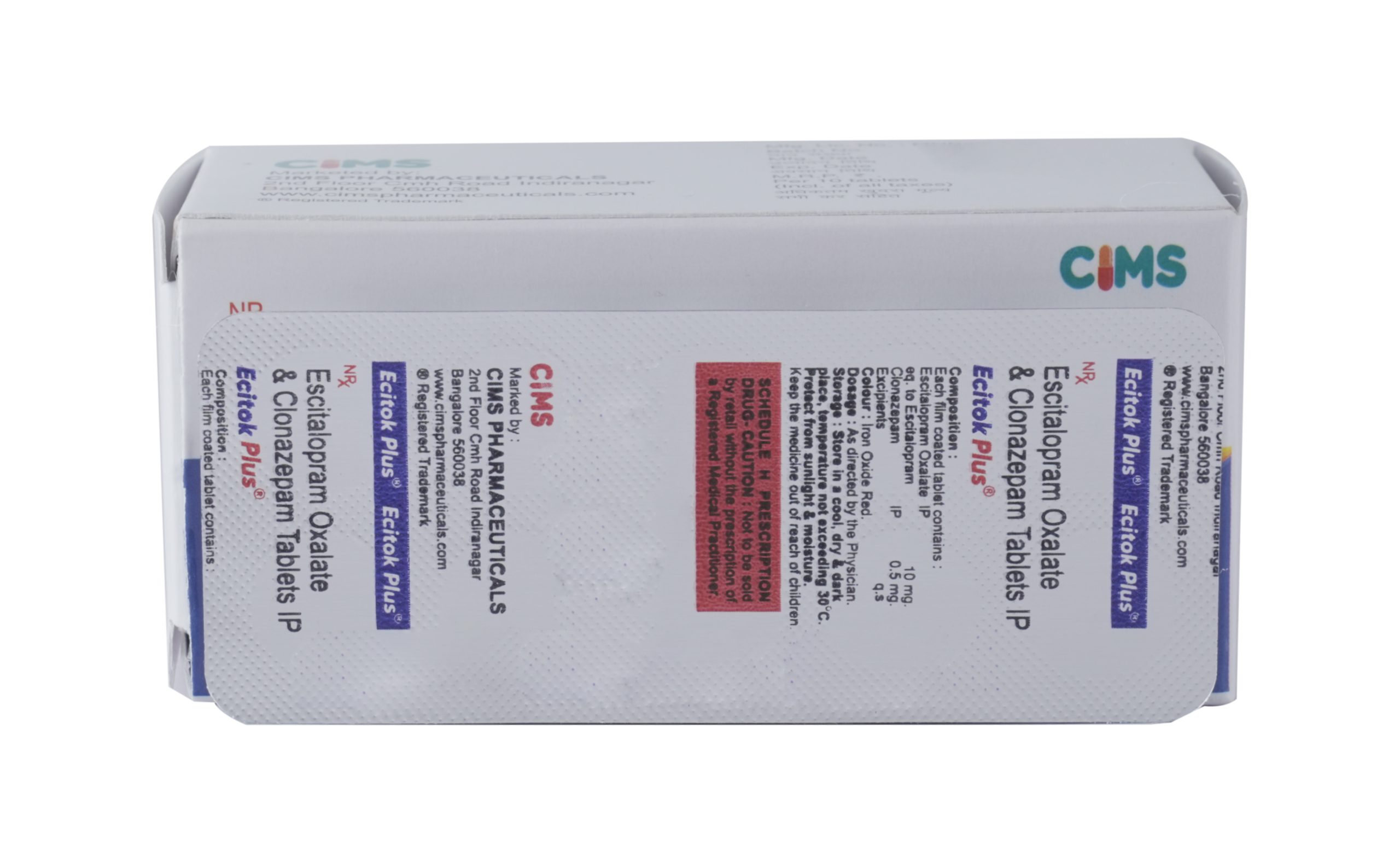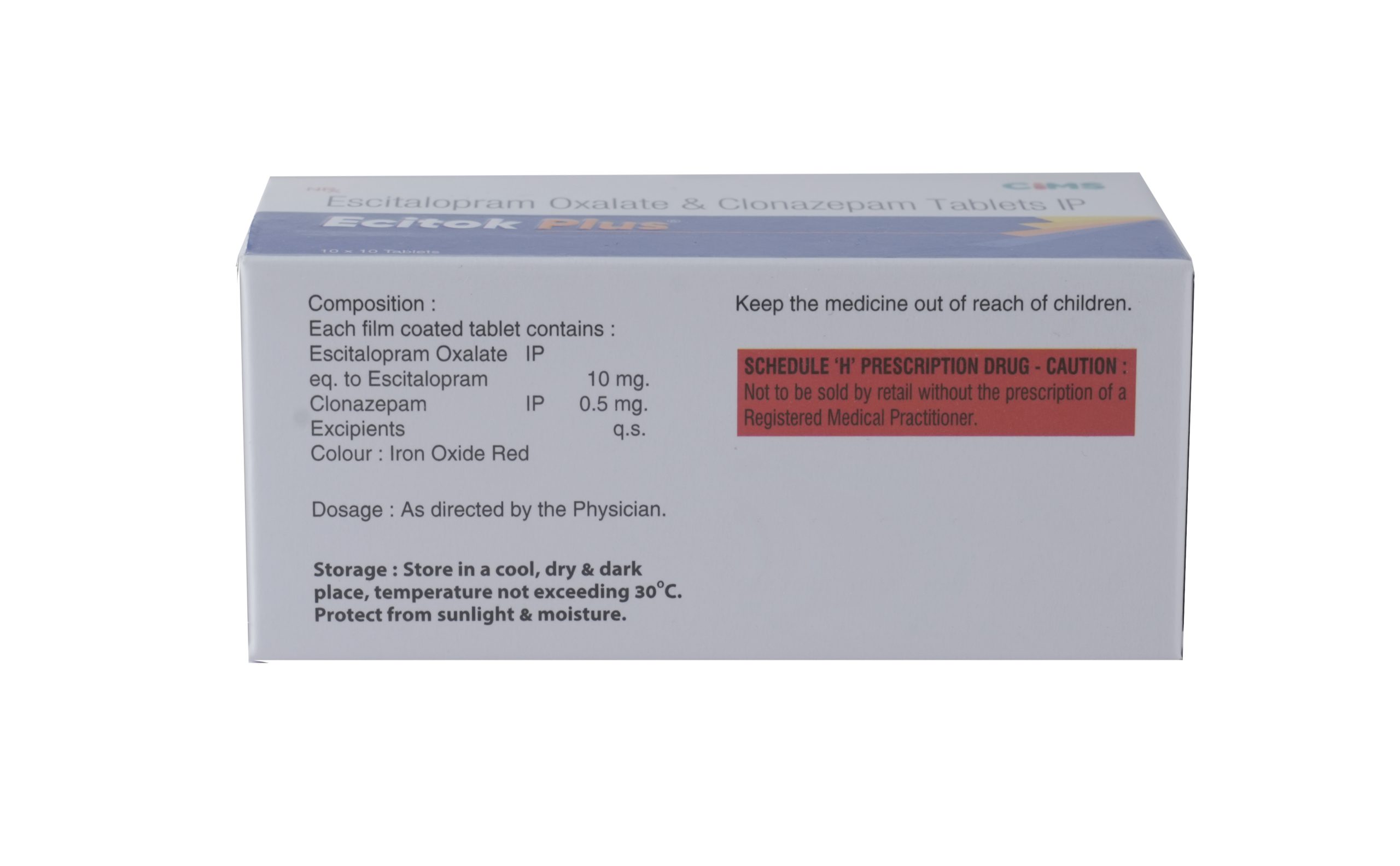Ecitok Plus Tablet is a combination of two medicines: Clonazepam and escitalopram, which has anxiety-lowering and mood-enhancing effects. Clonazepam is a benzodiazepine (BZD) which increases the action of GABA, a chemical messenger that suppresses the abnormal activity of the nerve cells in the brain. Escitalopram is selective serotonin reuptake inhibitor (SSRI) which increases the levels of serotonin, a chemical messenger that improves mood.