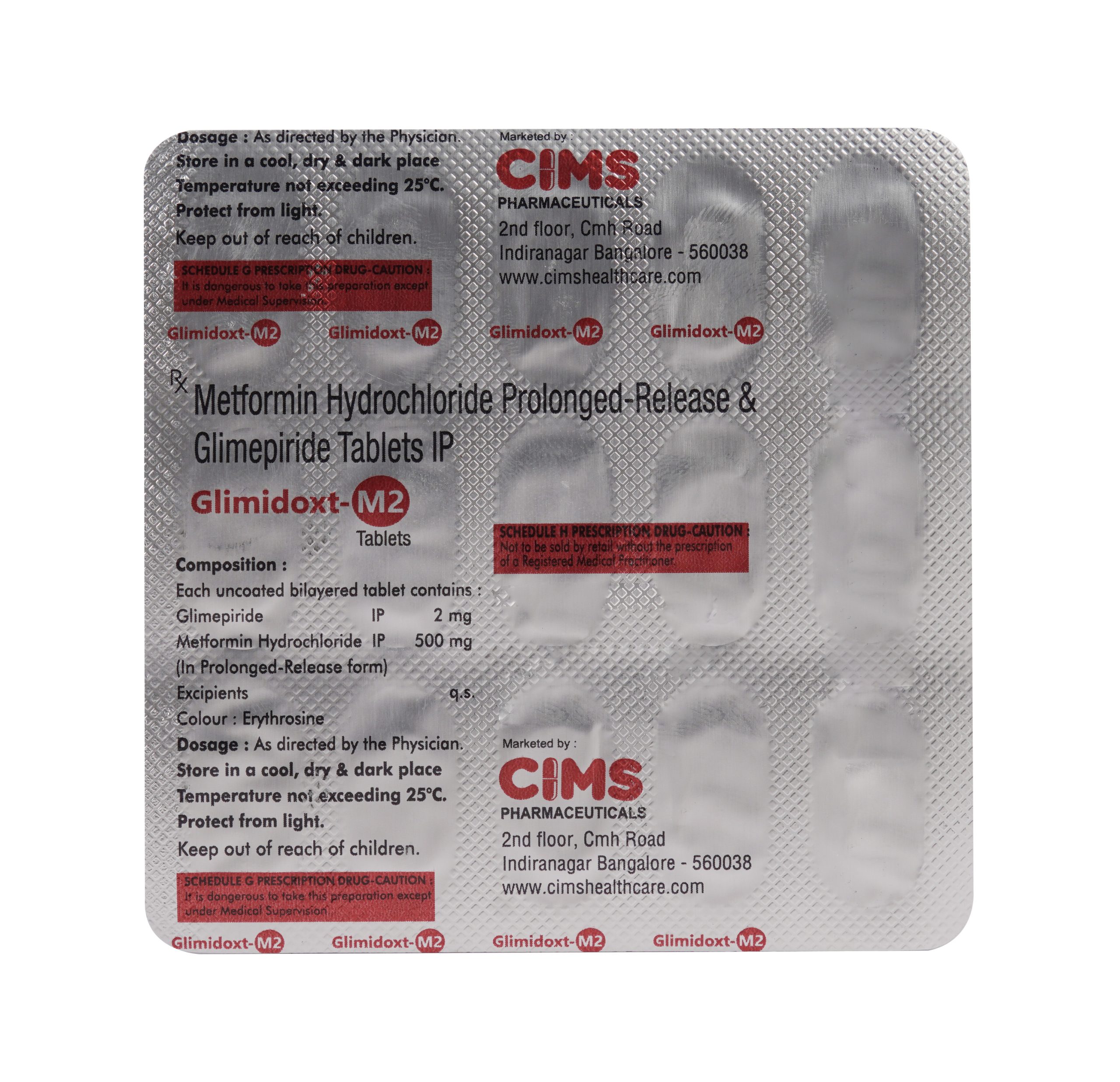 Glimidoxt M 2 Tablet PR is a combination of two antidiabetic medicines: Glimepiride and Metformin. Glimepiride is a sulfonylurea which works by increasing the amount of insulin released by the pancreas in order to lower the blood glucose. Metformin is a biguanide which works by lowering glucose production in the liver, delaying glucose absorption from intestines and increasing the body’s sensitivity to insulin.