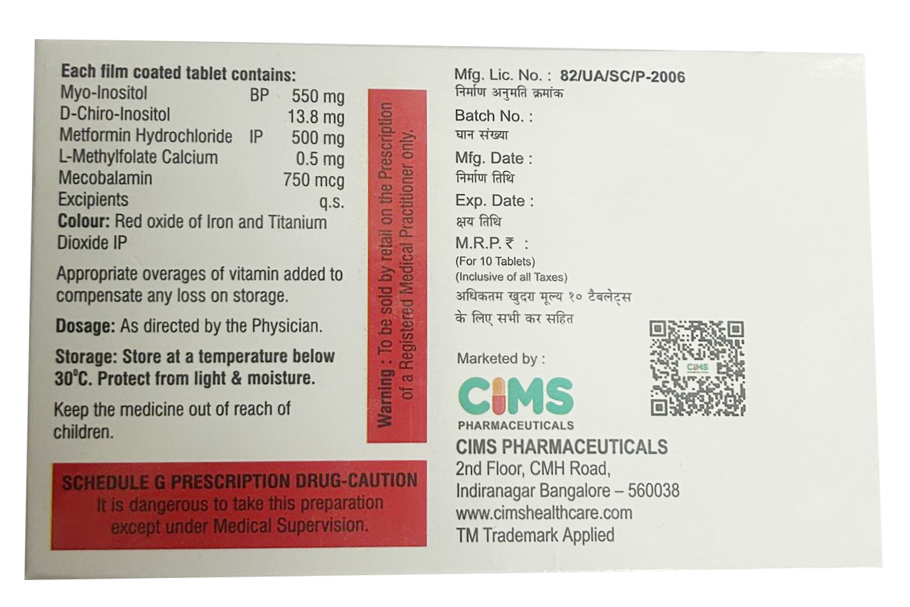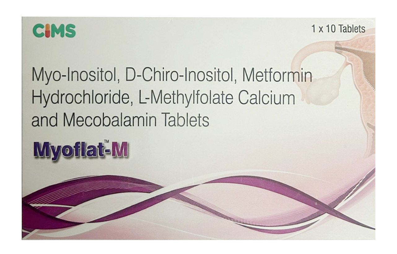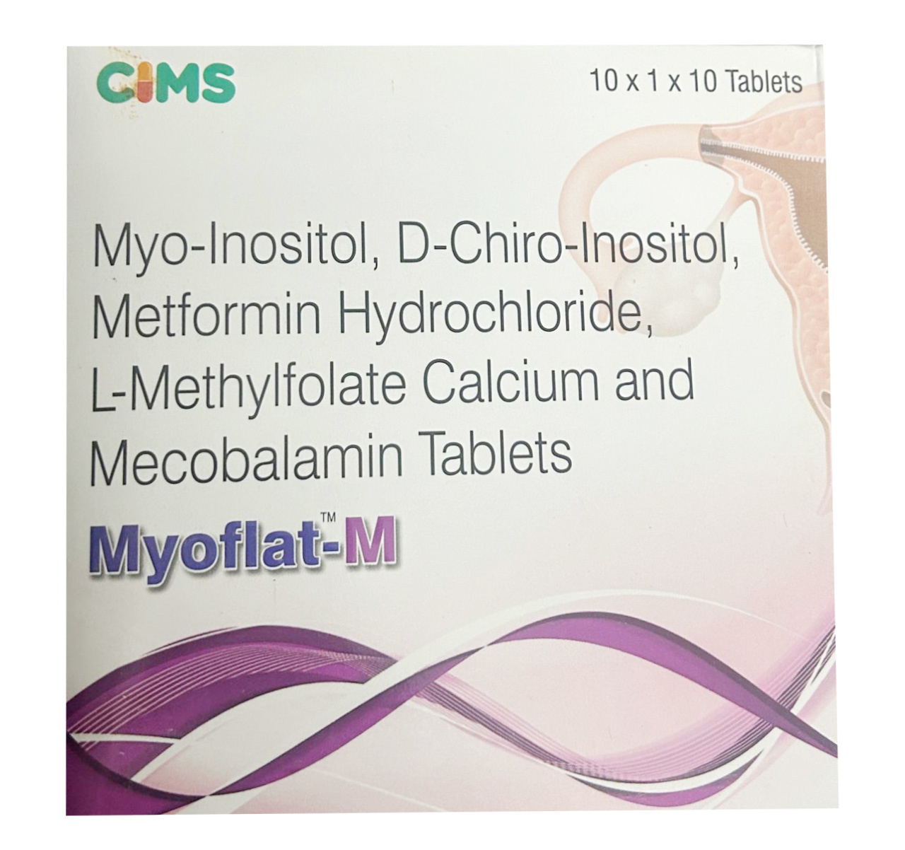 Myoflat-M Tablet is a combination of four medicines: Metformin , L-Methyl Folate , Methylcobalamin/Mecobalamin and Myo-Inositol which treat polycystic ovarian syndrome (PCOS) in females. Metformin helps regulate hormones in PCOS by balancing insulin levels. This effect leads to more regular menstruation and ovulation cycles. L-Methyl Folate and Methylcobalamin/Mecobalamin provide essential nutrients. Myo-Inositol ensures proper binding of insulin to its receptors and regulates the signaling that follows the binding process. Like this, it enhances body’s response to insulin, and improves hormone balance.